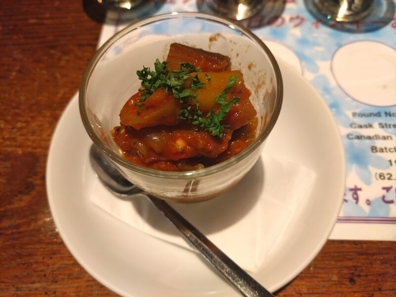 1品目は、冷やされている畑の野菜のピリ辛トマト煮から。まだまだ暑い日でしたので、ピリ辛さと食感も良く、スタートから愉しませていただきました。