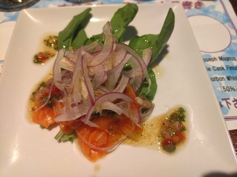 今回はウイスキーとお料理を頂きながら、最近見学された蒸溜所の事から始まり、ご参加者様の知り合いの方が現在蒸溜所で働かれている事、ウイスキーイベント、最近伺ったBarのお話、現在開催されているスタンプラリーのお話、そしてジンについてのお話、更に差し上げる際のお土産について、又お仕事のお話等1つ1つの内容がとても濃く、笑いも出て、楽しく過ごしていただいたのではと思っております。